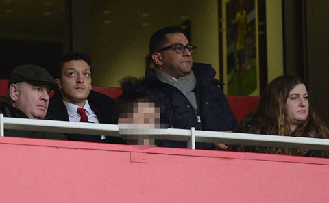 Oezil và thám tử Simon Jones (trái) trên khán đài sân Emirates