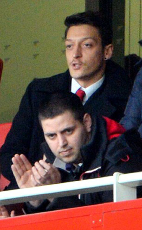 Ngay phía dưới Oezil, điều tra viên Dean Sliney đang cổ vũ Arsenal thi đấu